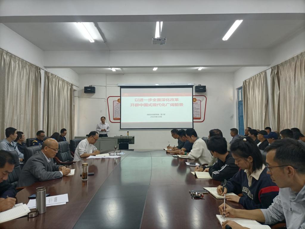 (通讯员 詹中新)10月10日下午,伟德国际victor1946举行党的二十届三中全会精神宣讲会,政法学院院长聂军作题为《进一步全面深化改革开辟中国式现代化广阔前景》的宣讲报告,伟德国际victor1946全体教职工参加学习。会议由伟德国际victor1946党委书记罗华国主持。