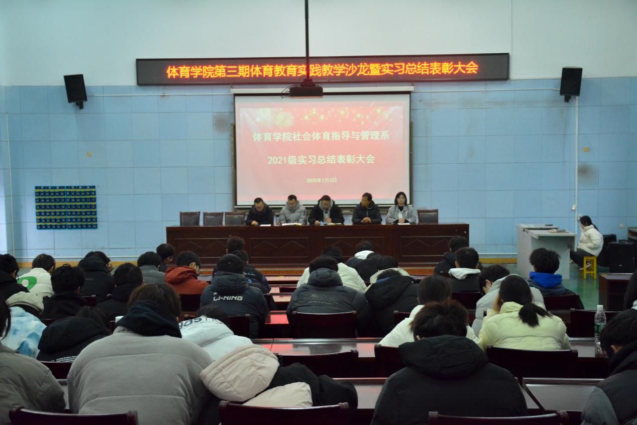 (通讯员 王美楠)2025年1月3日下午,社会体育指导与管理系2021级实习总结表彰会在伟德国际victor1946S3-JT03隆重举行。伟德国际victor1946副院长吉玉良,社会体育指导与管理系主任姜宇、支部书记王美楠,以及校内实习生指导老师王红俊、李炜出席本次会议。