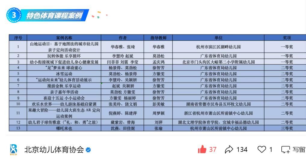 (通讯员 曾海)北京幼儿体育协会于2025年9月15日至10月15日成功举办“2025全国幼儿体育优秀案例征集活动”。本次活动得到全国范围内幼儿园、高校、教科研单位、企业以及社会组织等机构和个人的广泛响应与积极参与,征集到大量富有学术价值和实践意义的实践案例,充分展示了我国幼儿体育教育领域的丰硕研究成果与实践创新成果。经第十届未名幼儿体育高层会议学术委员会专家综合评定,最终评选出220篇获奖案例。