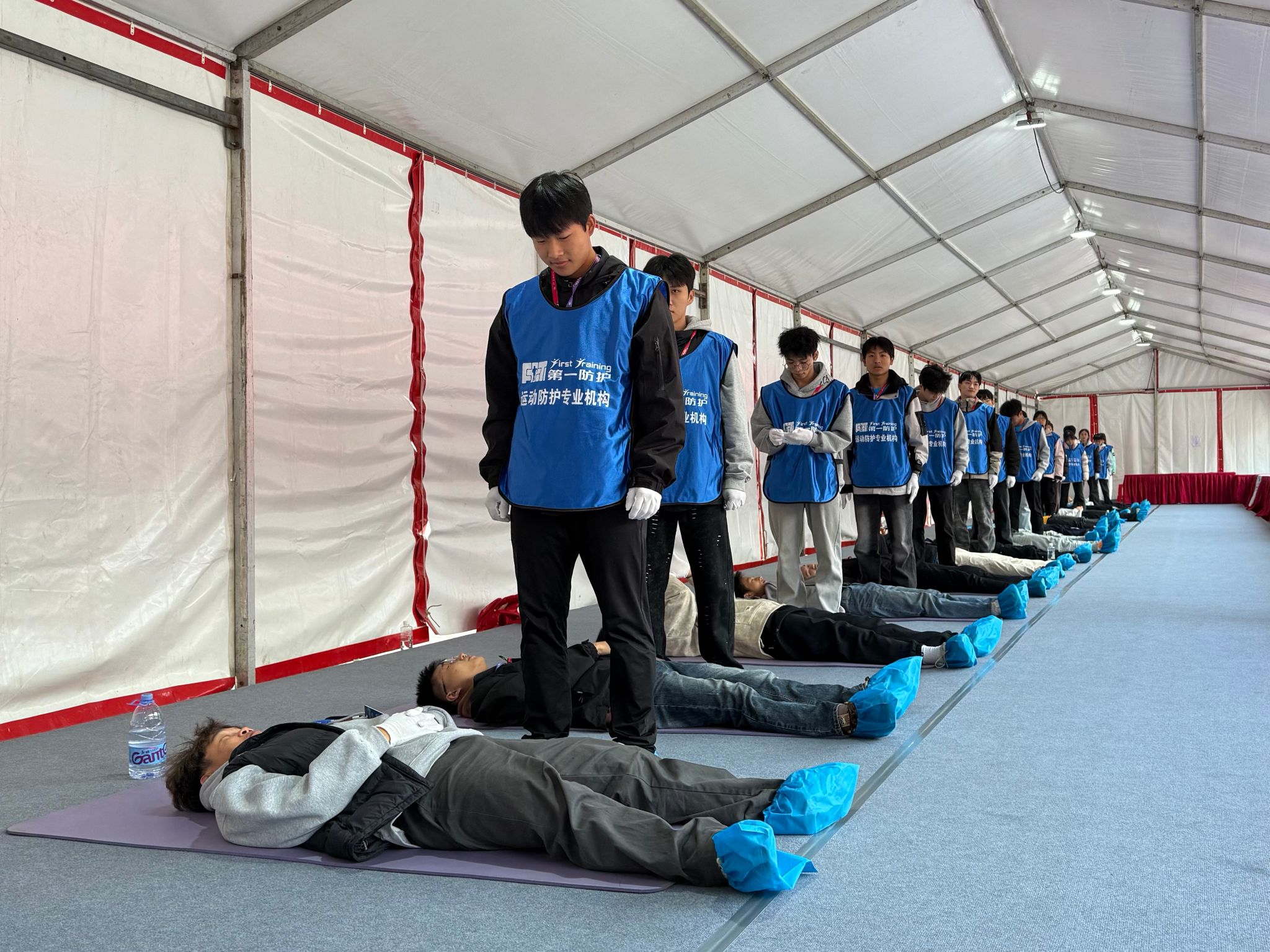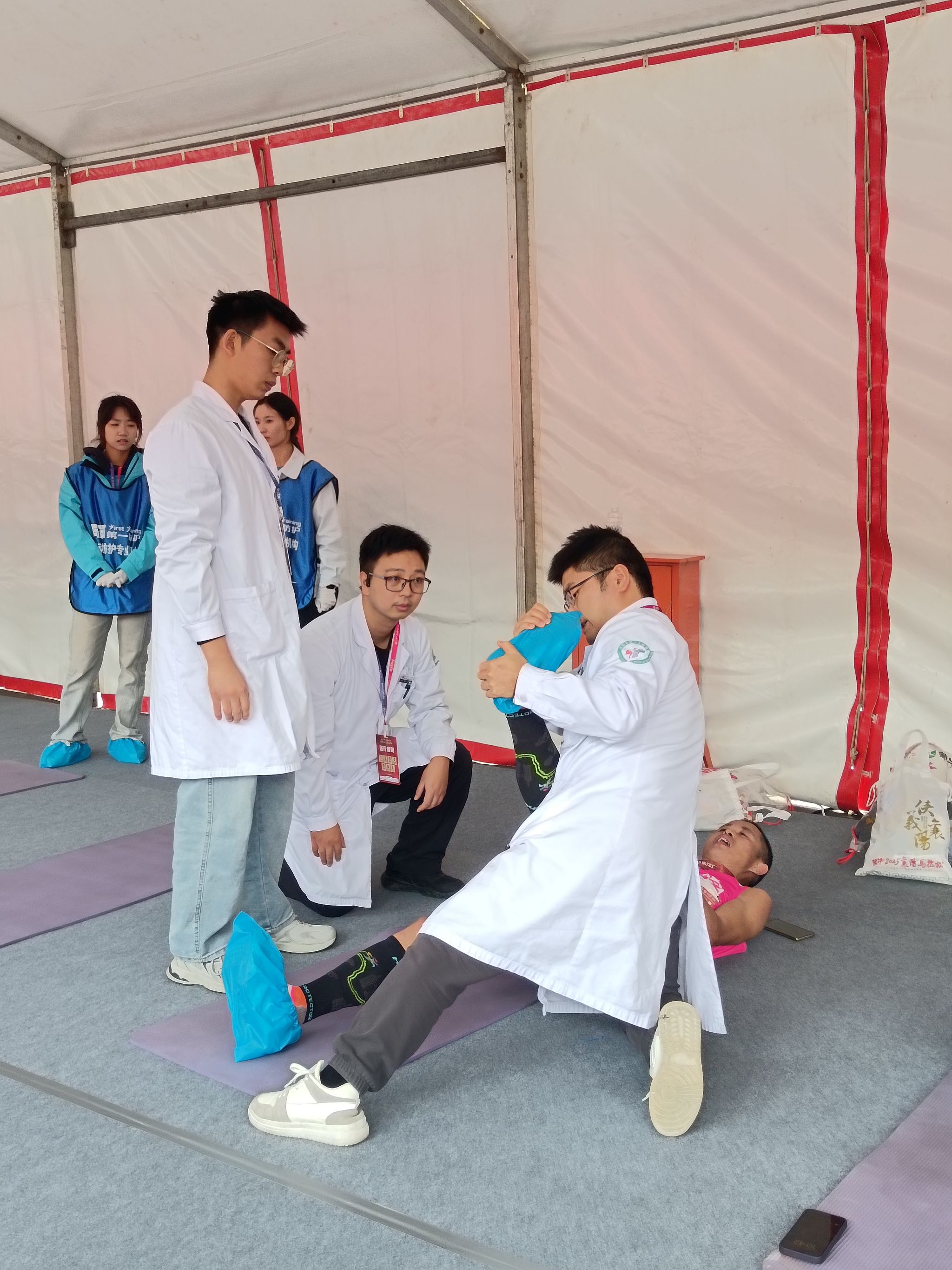 一到现场,同学们立即投入工作,搬运垫子、摆放物资、准备手套和鞋套……所有人默契配合,迅速布置好赛后拉伸区。之后还专门进行了拉伸动作复习,只为能给完赛选手最到位、安心的放松服务。