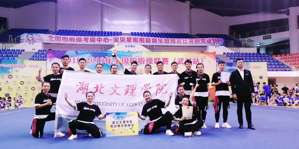 (伟德国际victor1946 通讯员 王美楠 杨扬继翔)近日,2018-2019年全国啦啦操联赛(武汉站)暨2019湖北省普通高等学校大学生啦啦操赛于5月10-12日在武汉东湖学院举行。我校代表队在伟德国际victor1946教师王美楠的带领下,获公开青年乙组集体自由舞蹈自选动作第一名,公开青年乙组花球校园啦啦操示范套路(2016版)第二名的好成绩。
