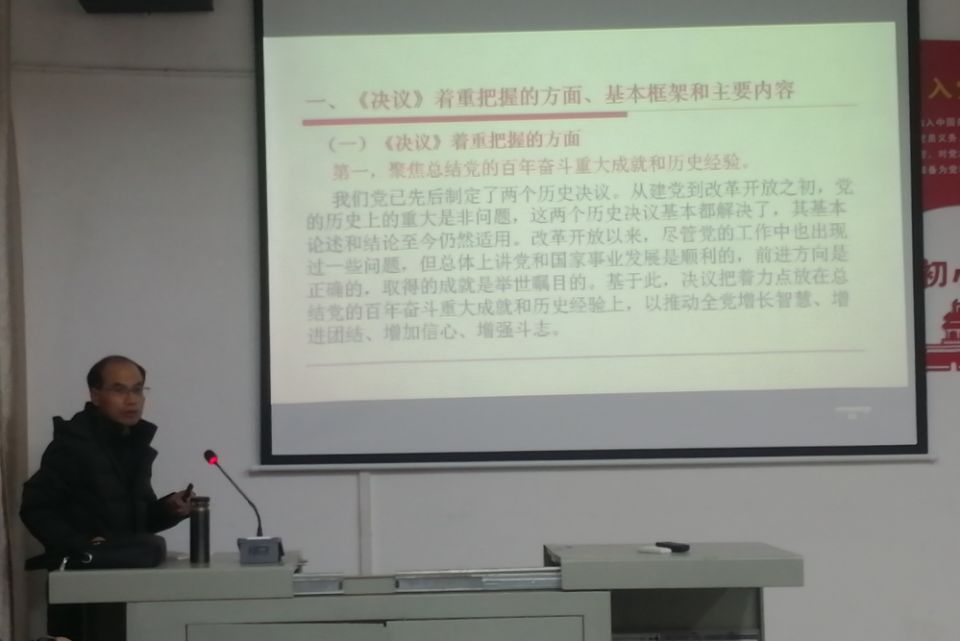 王悦洲以《鉴往知来 砥砺前行》为题详细为大家讲解了中国共产党领导人民在新民主主义革命、社会主义革命和建设、改革开放和社会主义现代化建设、开创中国特色社会主义新时代等四个历史进程中取得的重大成就,阐述了“两个确立”和坚决维护党的核心和党中央权威的重要意义、习近平新时代中国特色社会主义思想实现了马克思主义中国化新的飞跃这一理论问题,最后“以伟大自我革命引领伟大社会革命”介绍了我们党百奋斗历程中党坚持加强自身建设,不断实现自我净化、自我完善、自我革新、自我提高,保持党的先进性、革命性的历史过程。王悦洲通过一系列的历史故事和严谨的理论分析,帮助大家较好的理解十九届六中全会的精神,同时通过带领大家回顾我国的历史变迁,感受党的历史伟业,进一步坚定对共产主义和中国特色社会主义的共同信念,坚定实现国家“十四五”规划和学校“十四五”规划各项目标任务的信心。