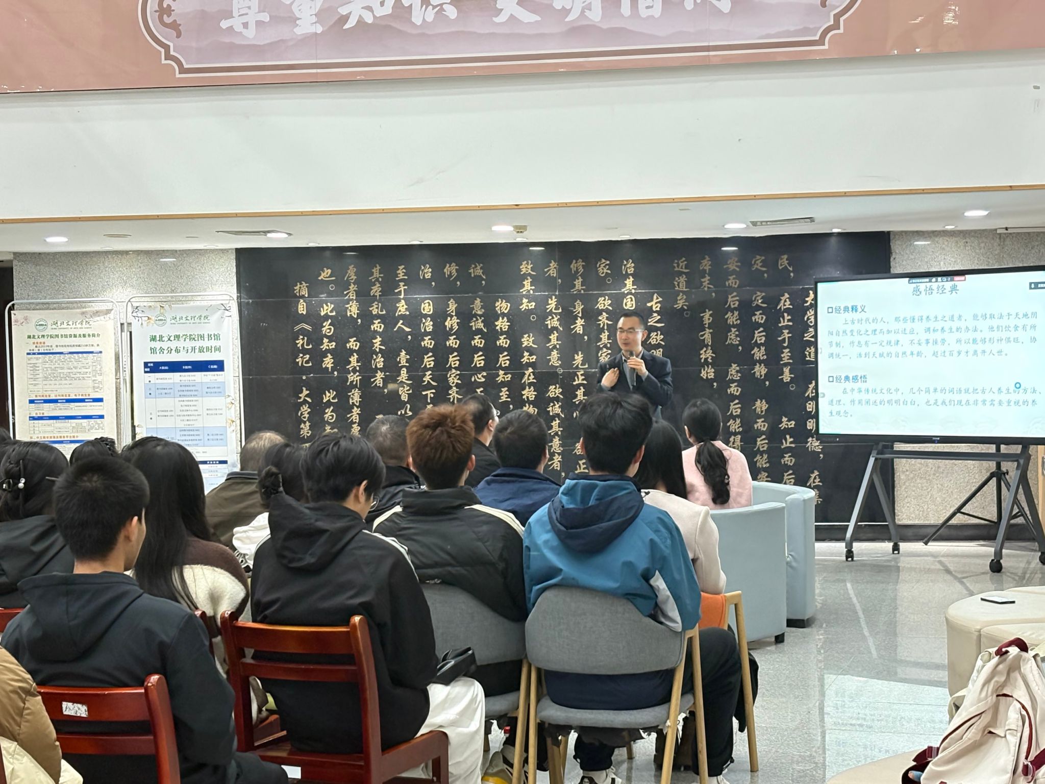 (襄阳历史文化研究院·汉江研究院 通讯员 高慧霞)11月6日下午,第四十七期“湖文读书会”在图书馆二楼德园举行。学校伟德国际victor1946副教授王红俊以“康”为主题作经典导读分享。学校党委副书记王瑶珺出席活动。